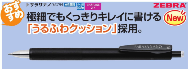 ゲル(ジェル)インクボールペン クッション効果で極細のガリガリ感を軽減します。ペン上部に搭載したスプリングが、過度に加わる筆圧を吸収します。 サラサナノ 0.38 JJX72-BK-N 注文番号00600インク色黒軸色ダークブルーボール径0.38mm長さ143.8mmインク種類水性顔料替芯JF-0.38芯材質樹脂 カタログ 商品を注文 ご注文の際は、注文番号をご記入ください。 下記カタログ 参照