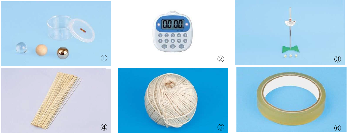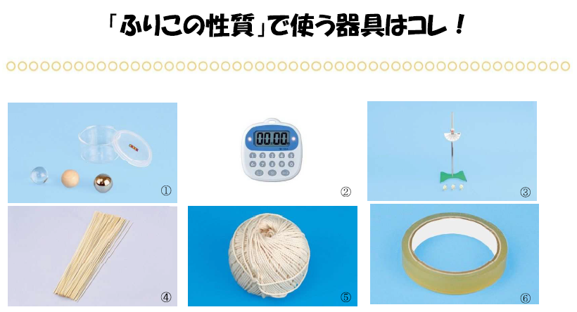 | 商品名 / 型式 | ①振り子の実験用球 (3種) (ものの重さ比較実験用球) ②デジタルタイマー / TM-12LS ③振り子実験器 (スタンド付) ④竹ひご φ1.8×360mm 100本 ⑤たこ糸 7号 (中) ⑥セロハンテープ |